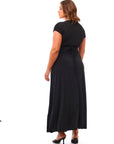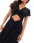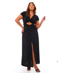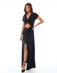 שמלת מקסי עם מחשוף V קדמי וגב סגור(המחשוף ניתן ללבישה במספר דרכים), חצאית בגזרה קרובה לגוף עם אלמנט סיבובי ושסע מקדימה, וגומי פנימי במותן אחורית.