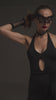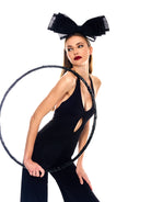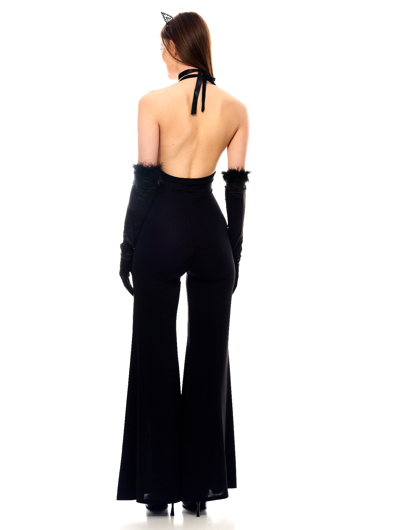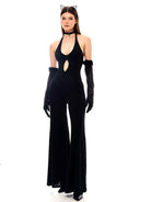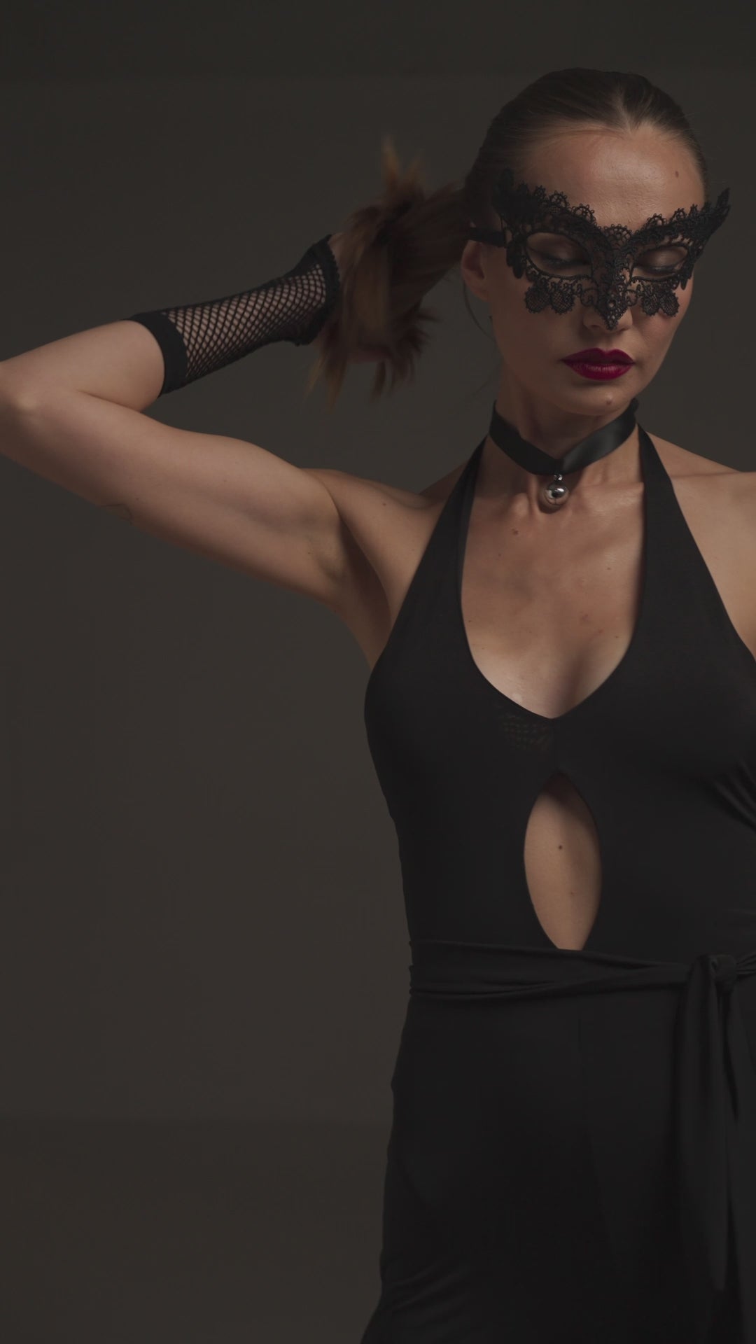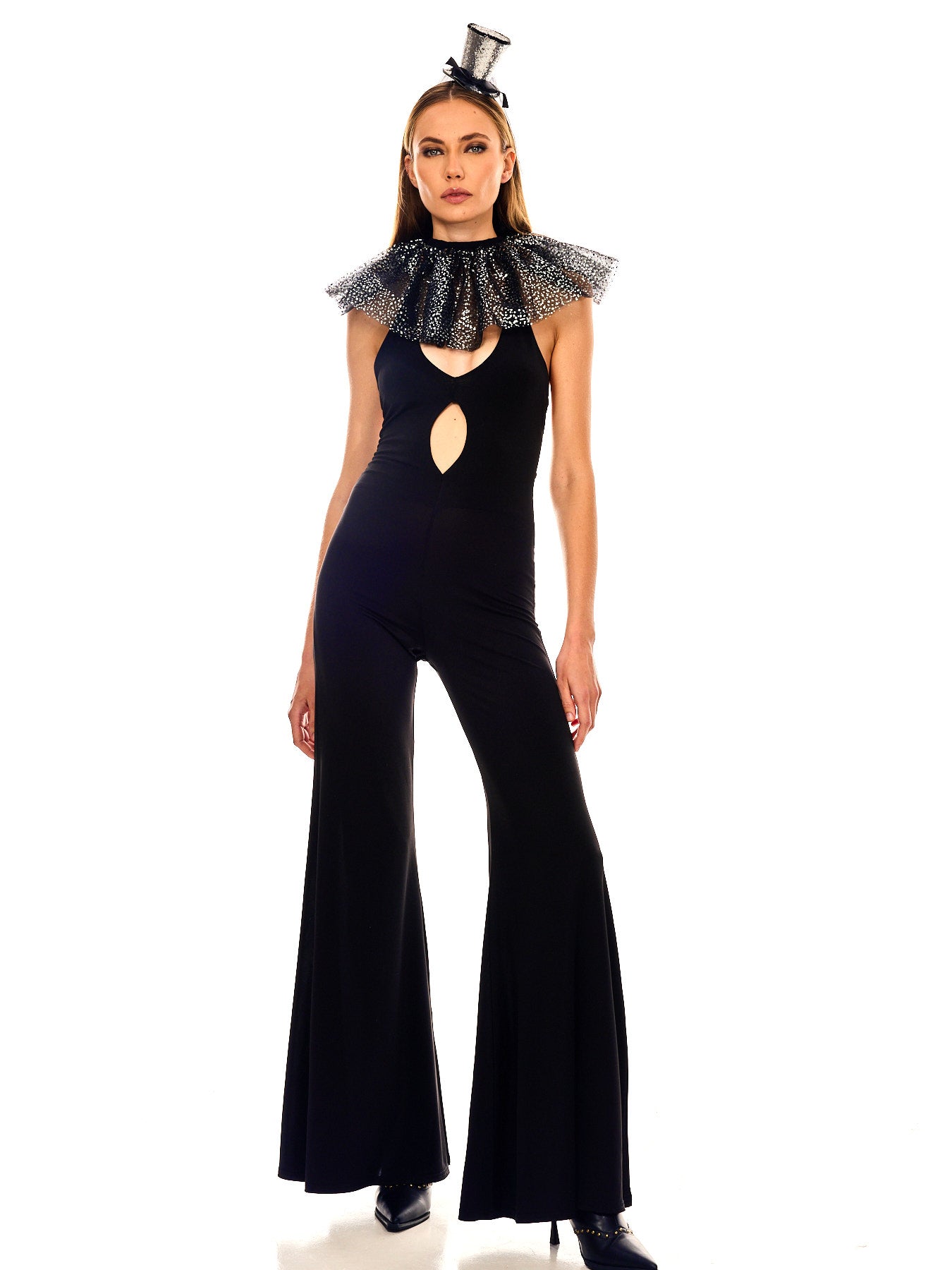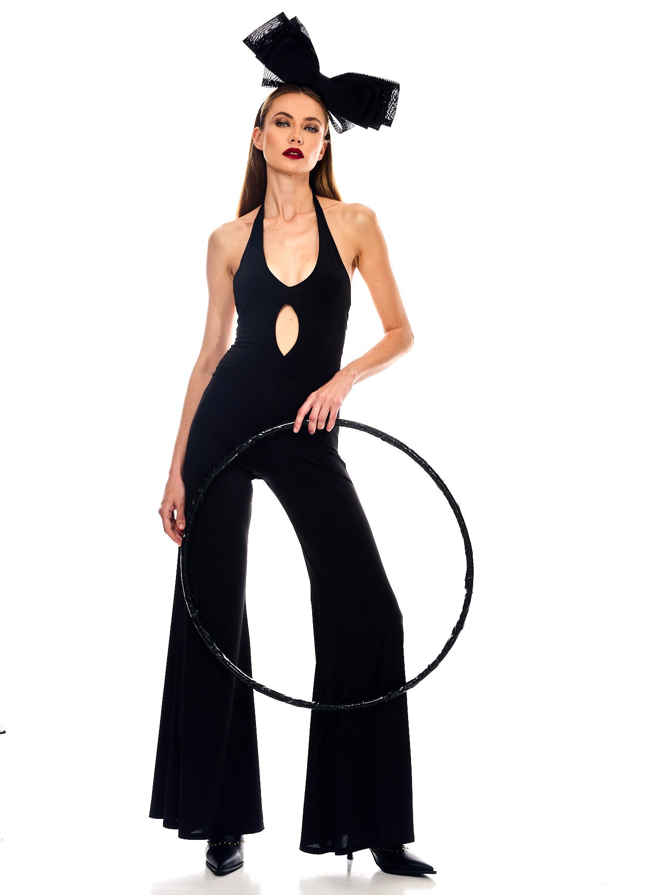 אוברול נמתח בגזרה צמודה ונועזת עם מפתח V ורצועות הנקשרות בצוואר להתאמה מושלמת. בחלקו העליון האוברול צמוד ומדגיש קימורים בעוד המכנסיים בגזרה מתרחבת. האוברול מגיע עם חגורת קשירה תואמת