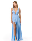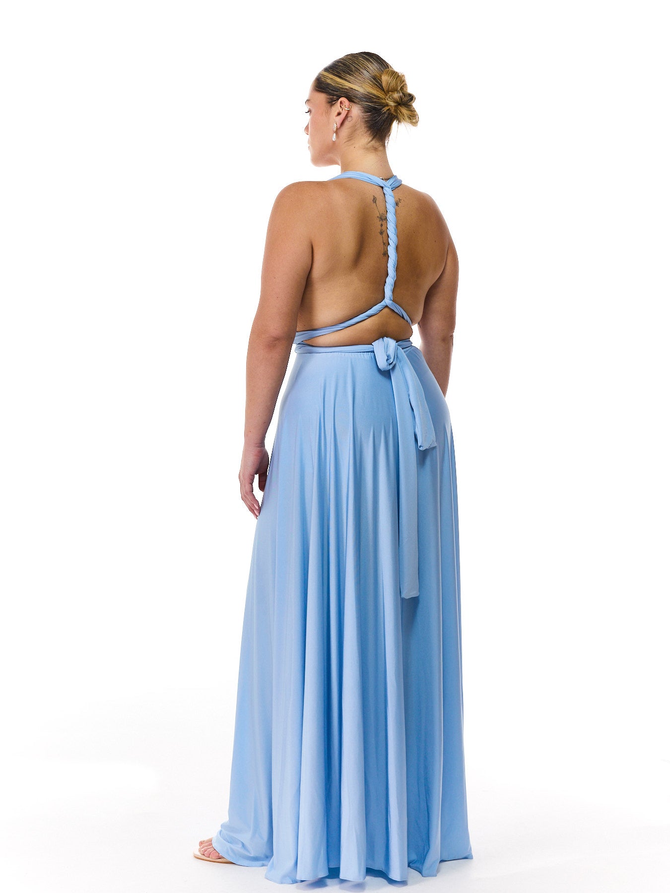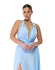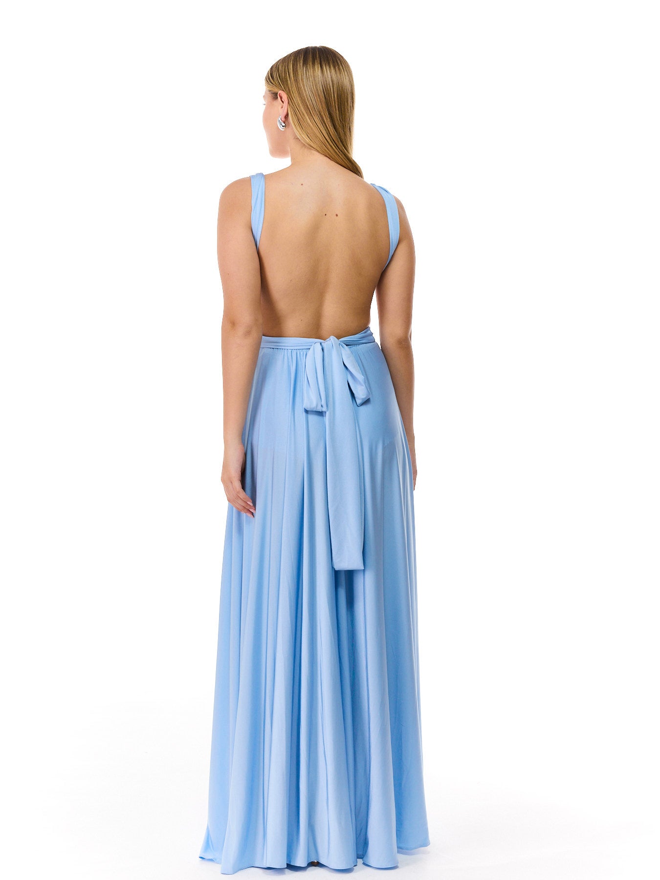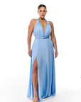 שמלת מקסי עם מחשוף קדמי עמוק הניתנת לקשירה במספר דרכים, חצאית מקסי המבוטנת בתחתון פנימי ושסע מקדימה.