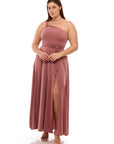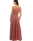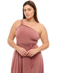 שמלת מקסי א-סימטרית, בגזרת כתף אחת עם לולאה הניתנת להזזה והתאמה, חצאית פעמון, שסע קדמי, גומי פנימי במותן, וחגורת קשירה תואמת.