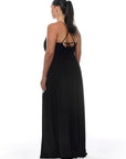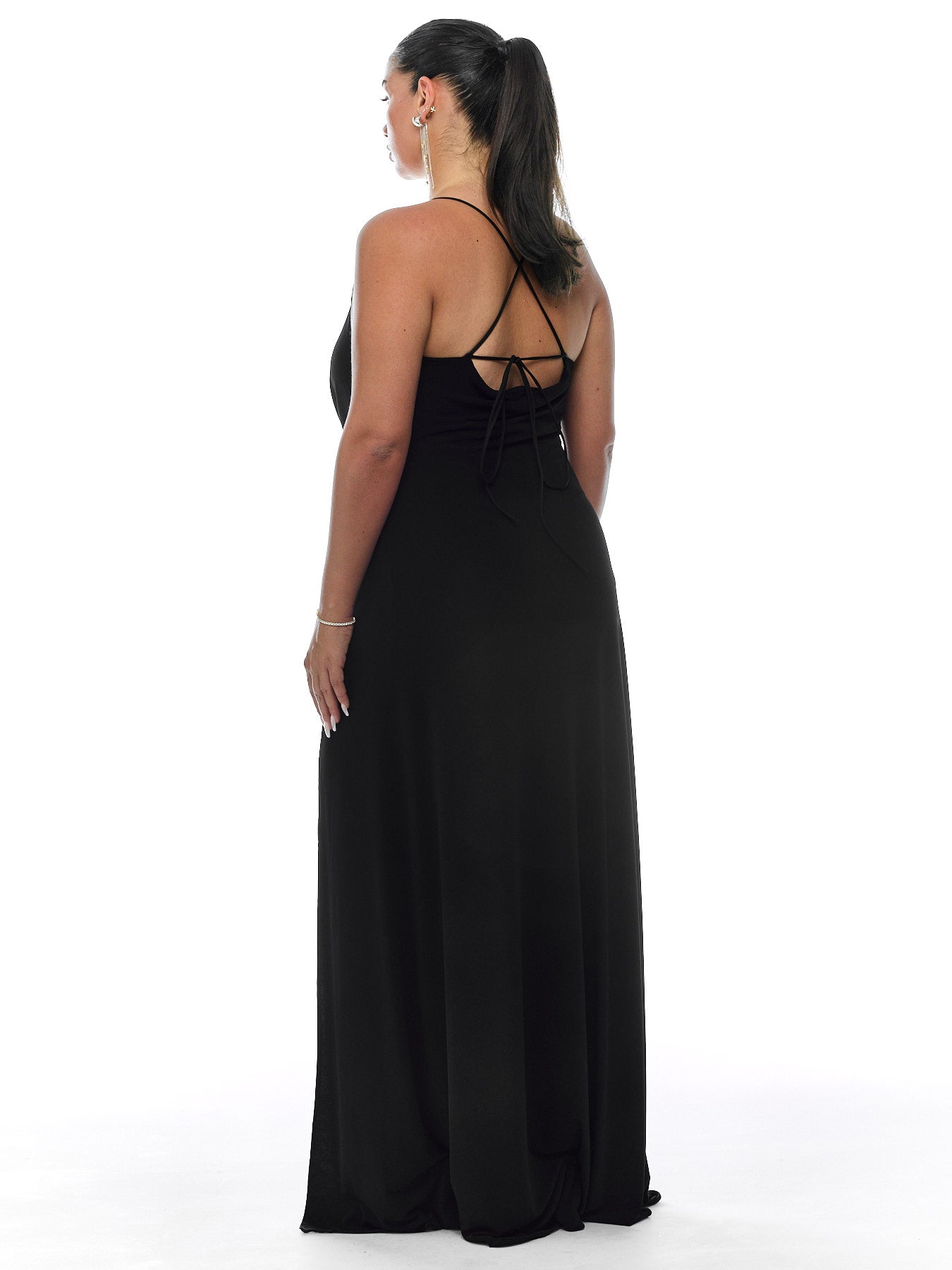 שמלת מקסי עם מחשוף דרפה קדמי, מבד לייקרה שנמתח על הגוף. כתפיה ארוכה הניתנת לקשירה בגב בכמה דרכים.