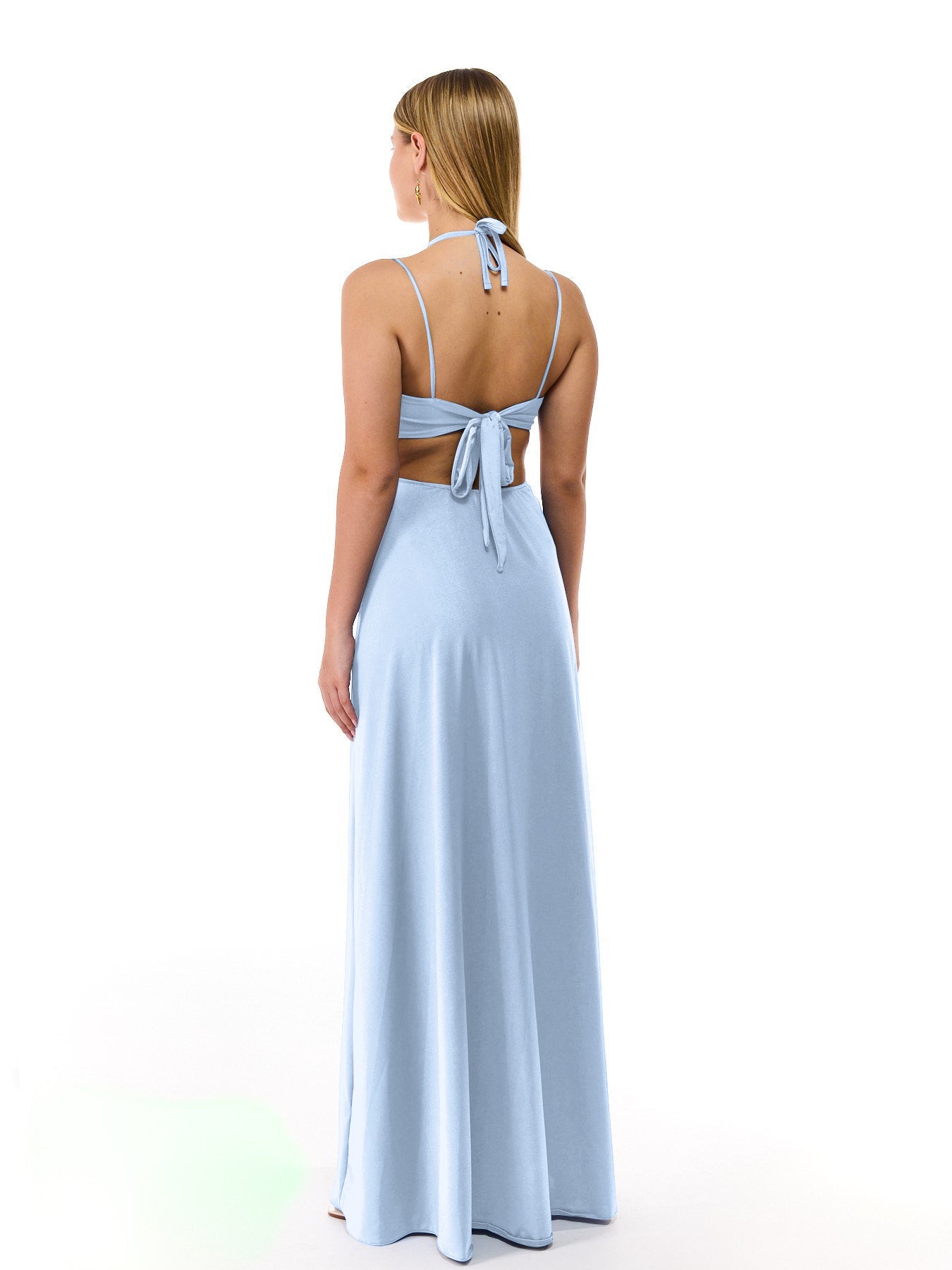 שמלת מקסי קאט-אאוט בגזרה קרובה לגוף, עם שסע קדמי וחלק עליון חזייתי הנקשר ומתהדק לפי מידותייך. **השמלה עשויה מבד לייקרה ולכן יכולה להתאים לטווח מידות