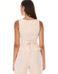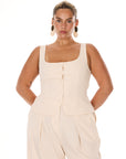 וסט מחויט מבד אריג, עם כפתרה קדמית וסרטי קשירה בגב להתאמה והידוק לפי רצונך. גזרה נקייה וקלילה שמתאימה לשילוב עם מכנס מחויט לעבודה או גינס וחצאית לערב.