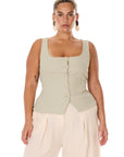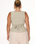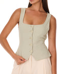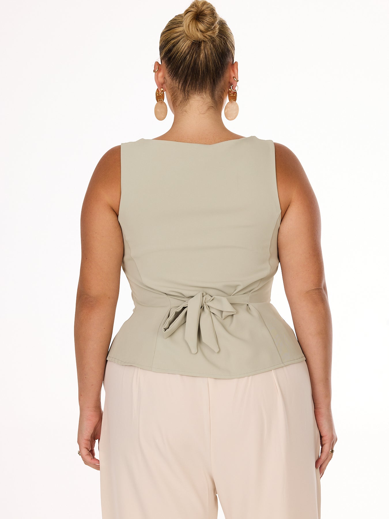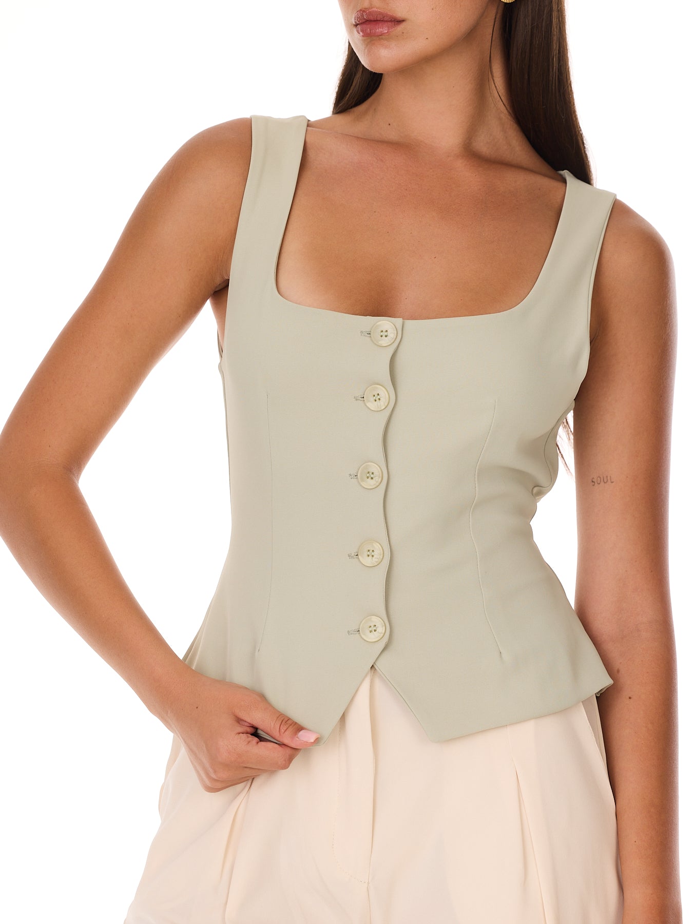 וסט מחויט מבד אריג, עם כפתרה קדמית וסרטי קשירה בגב להתאמה והידוק לפי רצונך. גזרה נקייה וקלילה שמתאימה לשילוב עם מכנס מחויט לעבודה או גינס וחצאית לערב.
