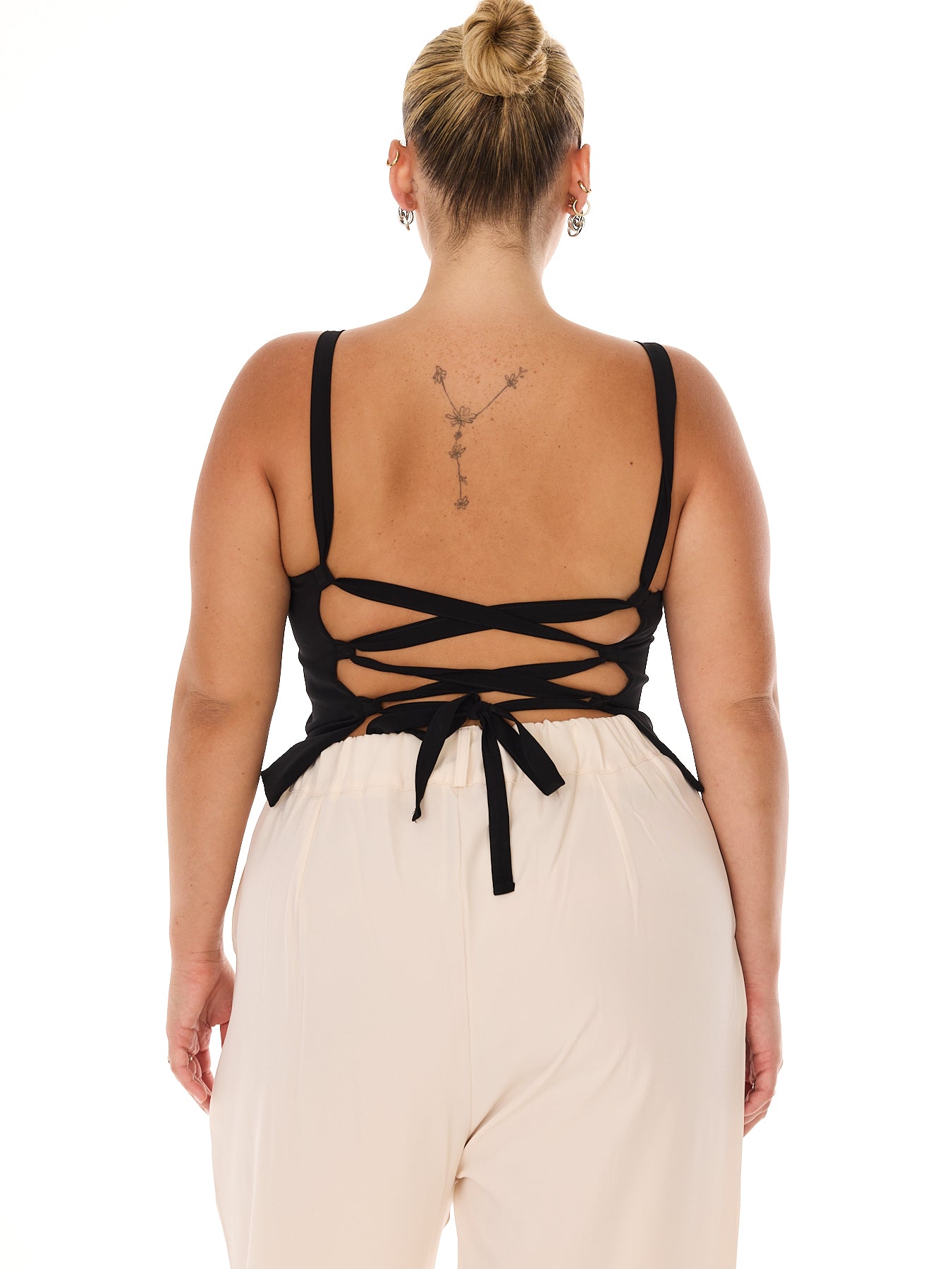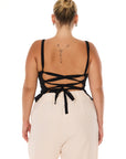 טופ עם גב פתוח וקשירה צולבת בגזרה מחטבת וצמודה לגוף. עשוי מבד אריג המחזיק את הגוף ומדגיש את המבנה הנשי. הקשירה מאפשרת התאמה אישית והידוק לפי מידותייך.