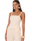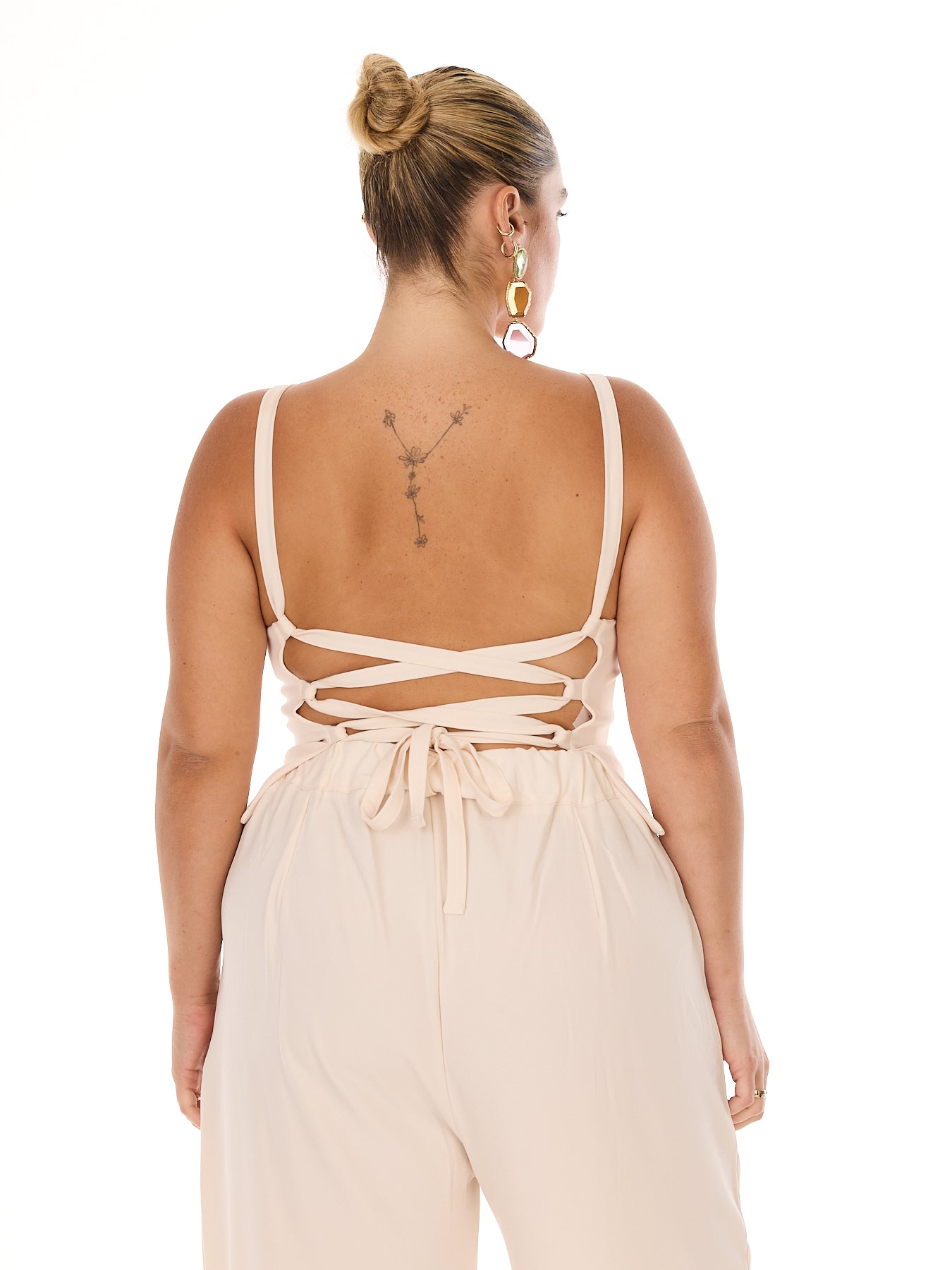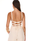 טופ עם גב פתוח וקשירה צולבת בגזרה מחטבת וצמודה לגוף. עשוי מבד אריג המחזיק את הגוף ומדגיש את המבנה הנשי. הקשירה מאפשרת התאמה אישית והידוק לפי מידותייך.