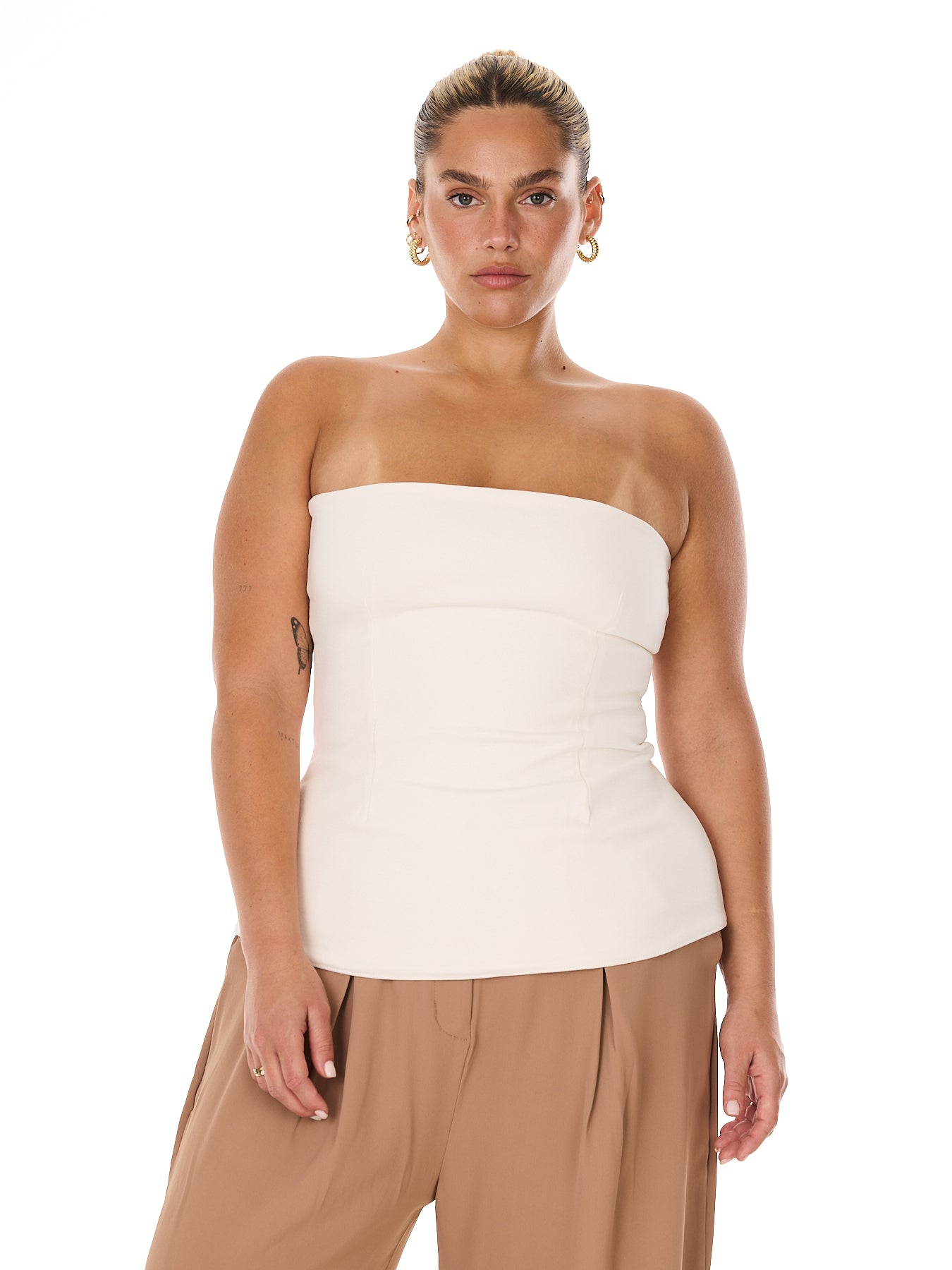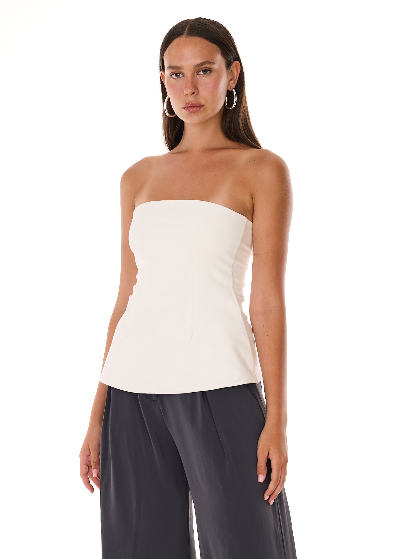 טופ סטפרלס בגזרה מחטבת וצמודה, עשוי מבד לייקרה איכותי לתמיכה ואחיזה מושלמת לגוף. קו נקי שמשתלב עם כל לוק-מחוייט, יומיומי או ערב.