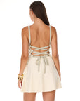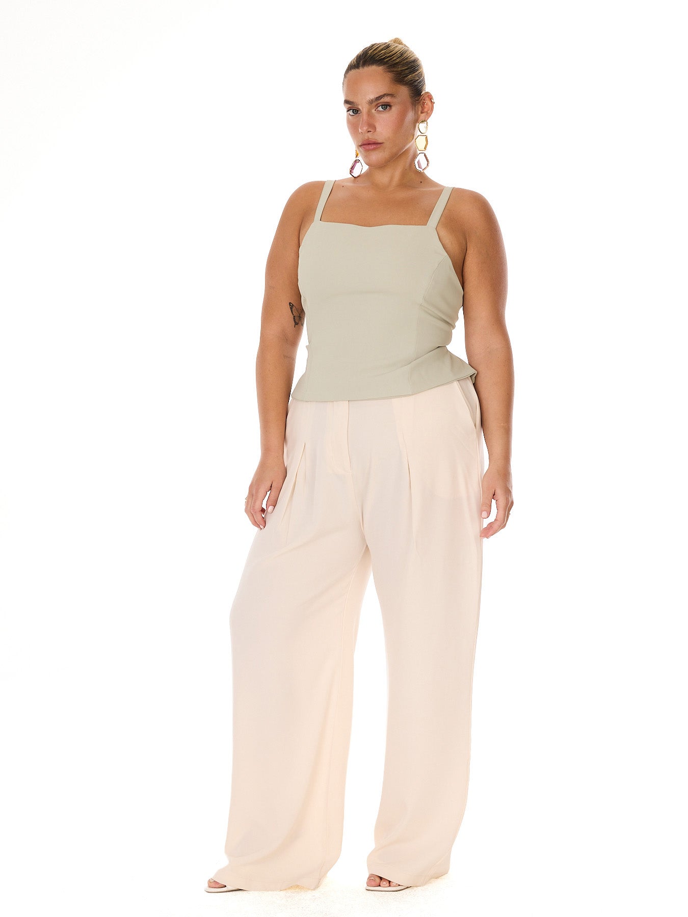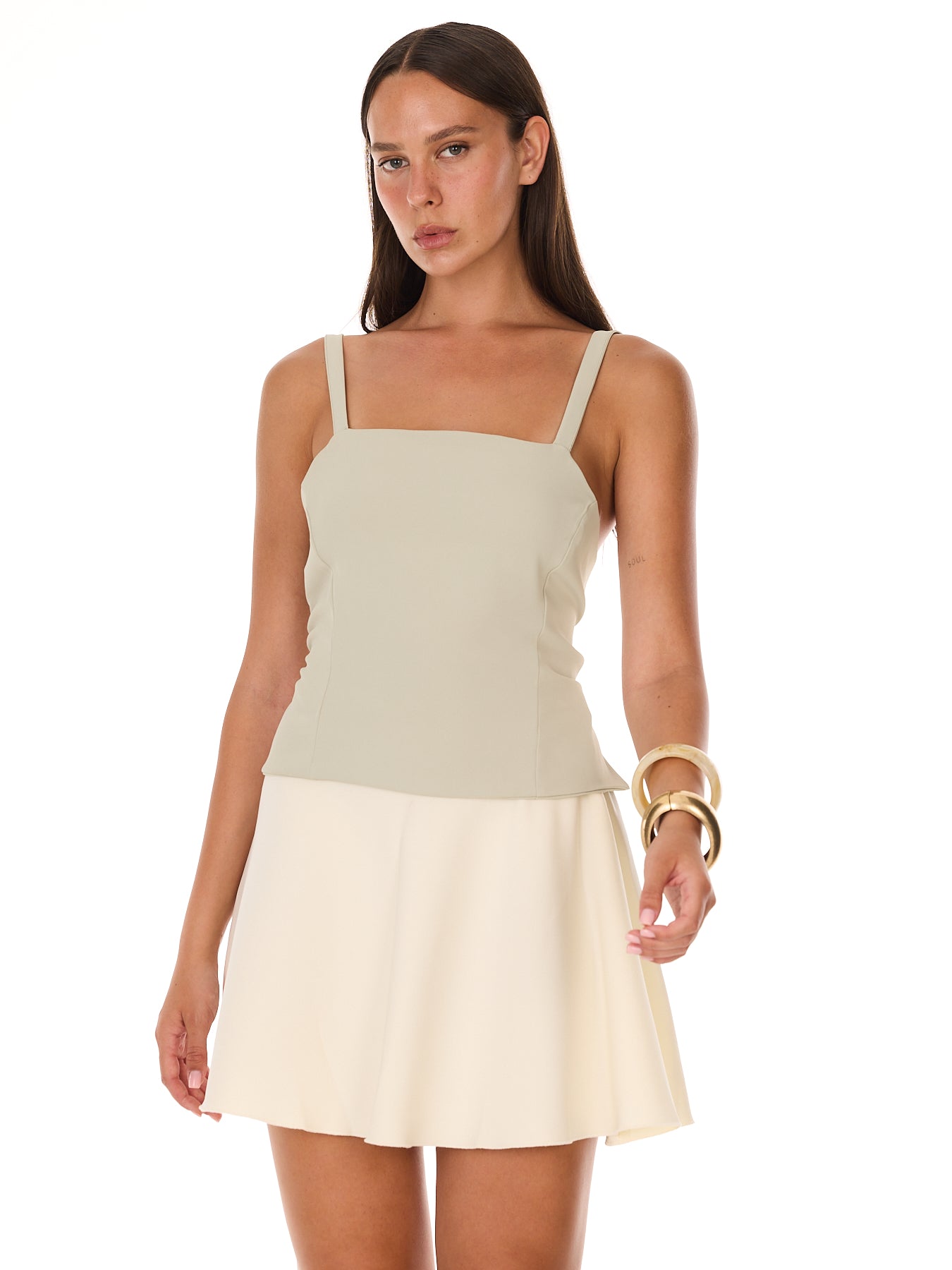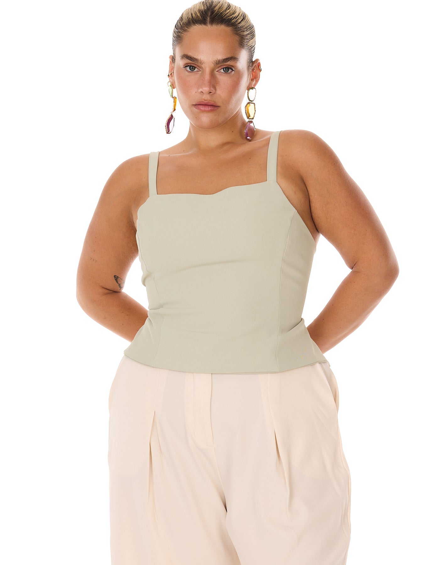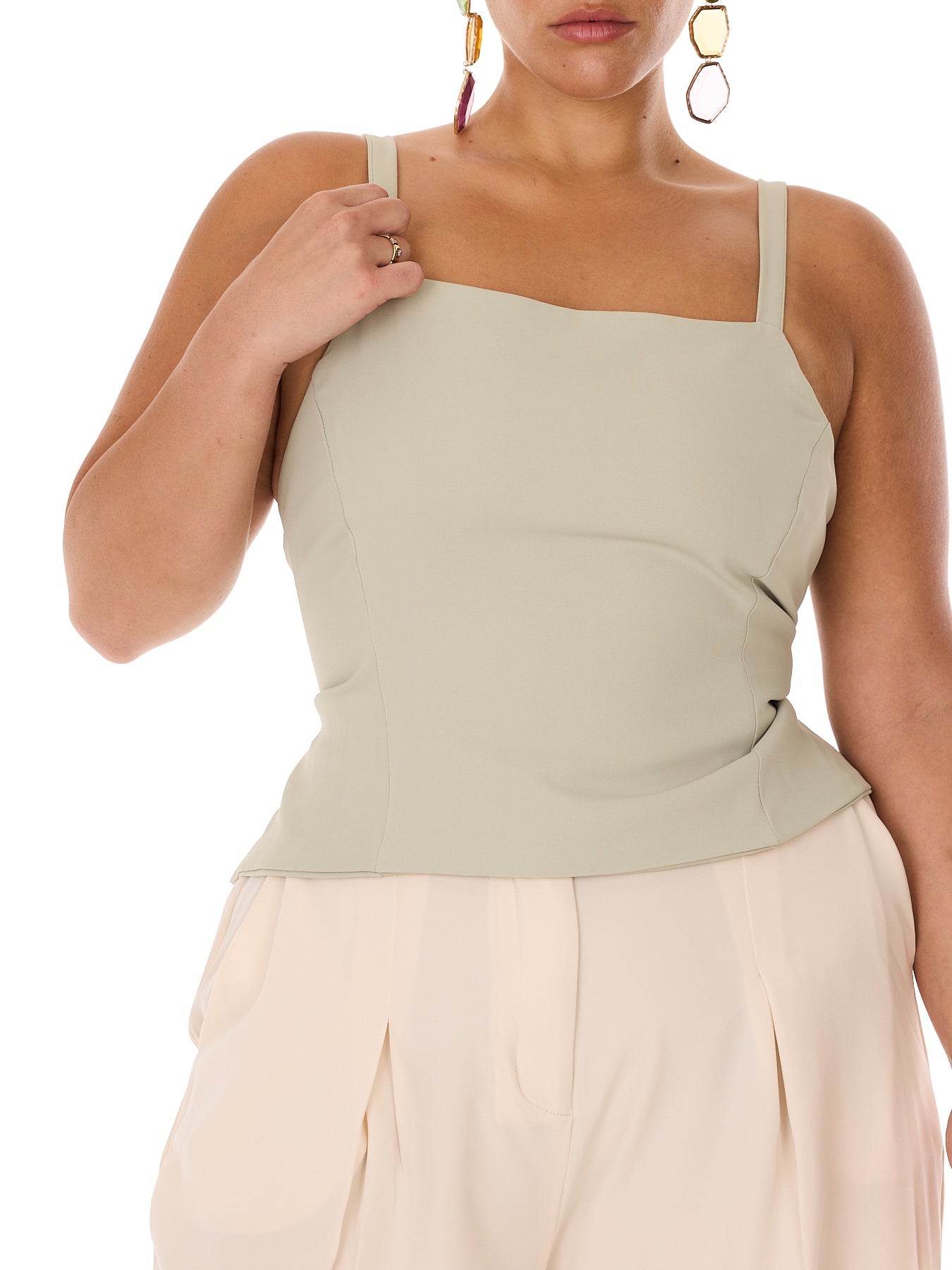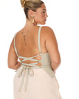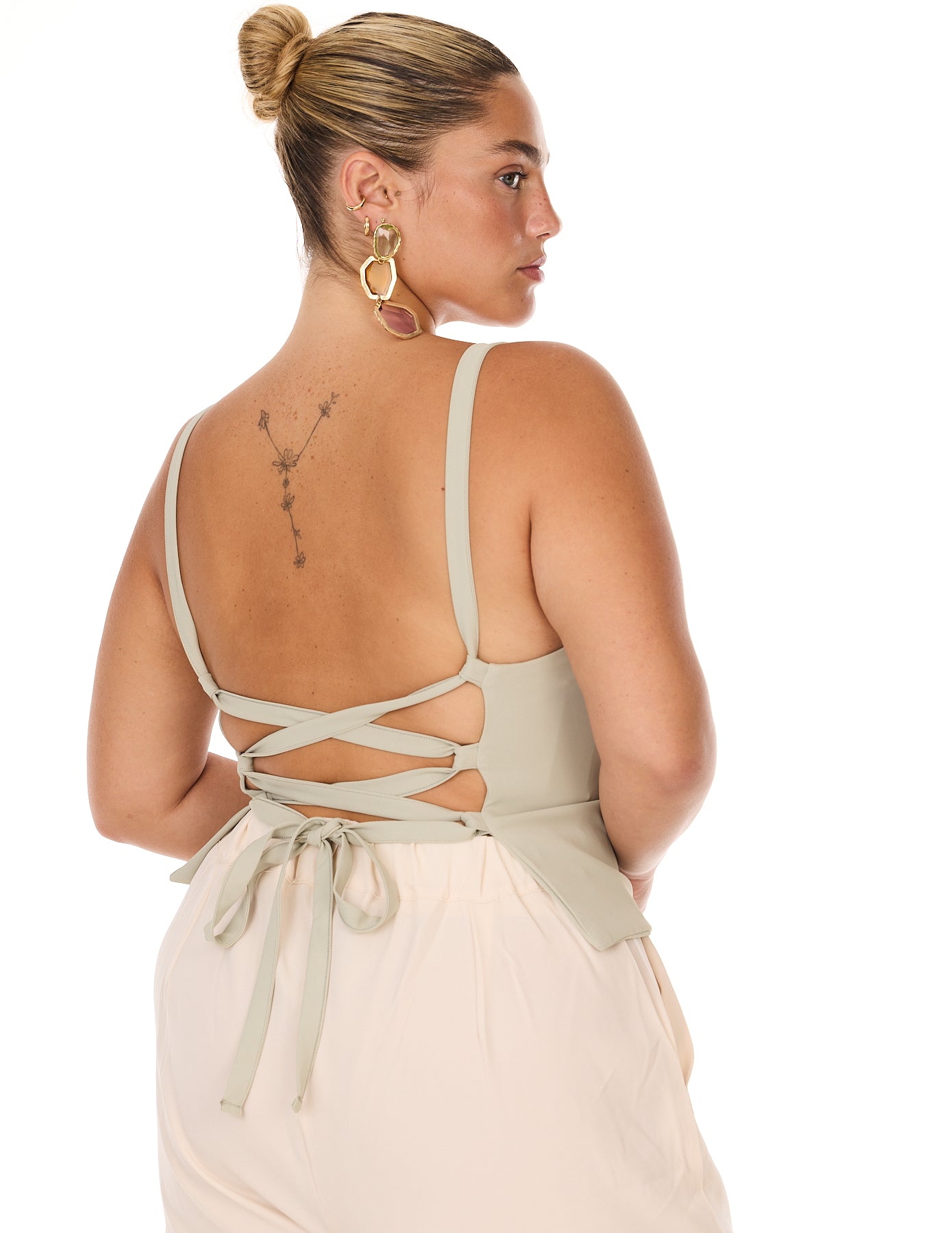 טופ עם גב פתוח וקשירה צולבת בגזרה מחטבת וצמודה לגוף. עשוי מבד אריג המחזיק את הגוף ומדגיש את המבנה הנשי. הקשירה מאפשרת התאמה אישית והידוק לפי מידותייך.