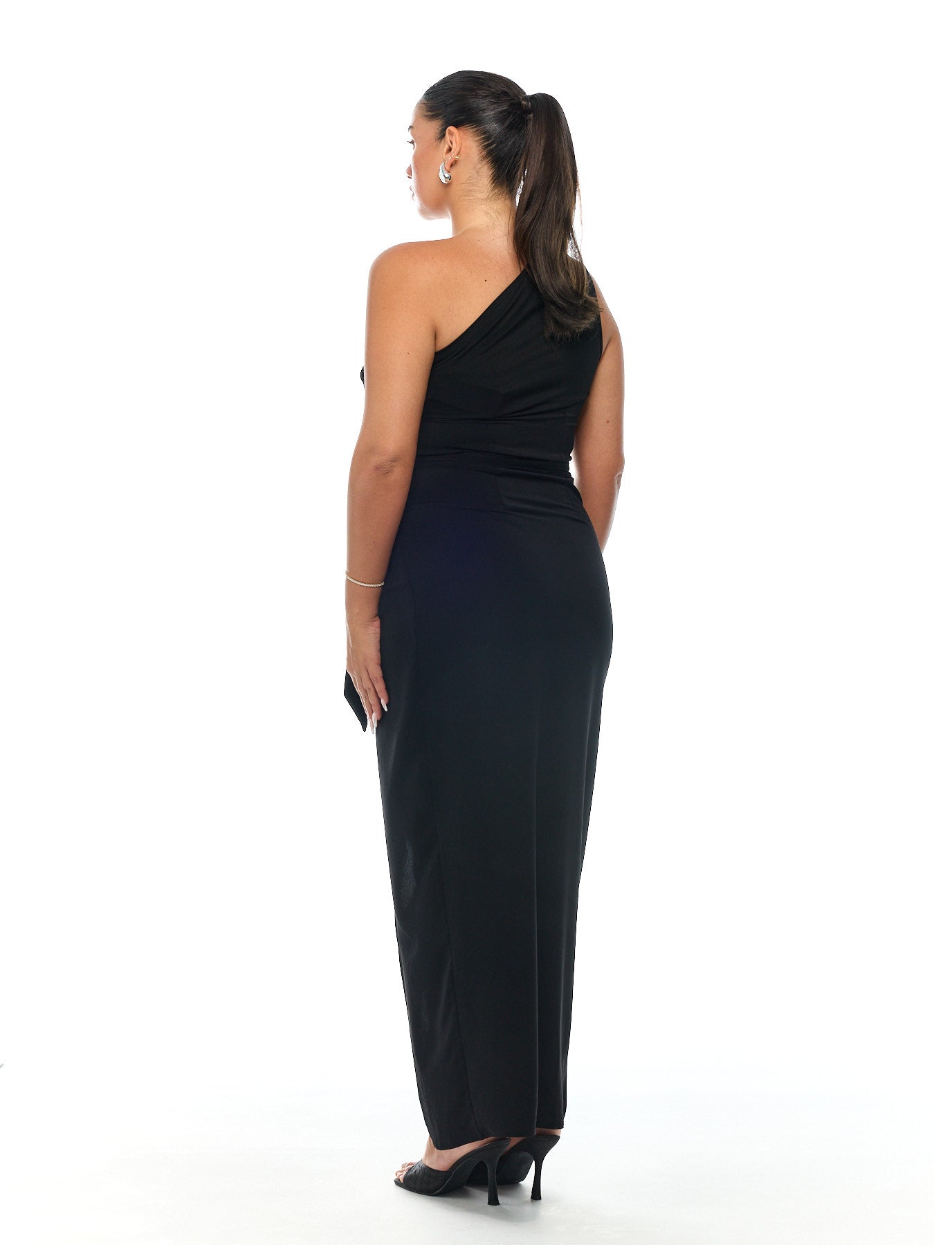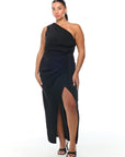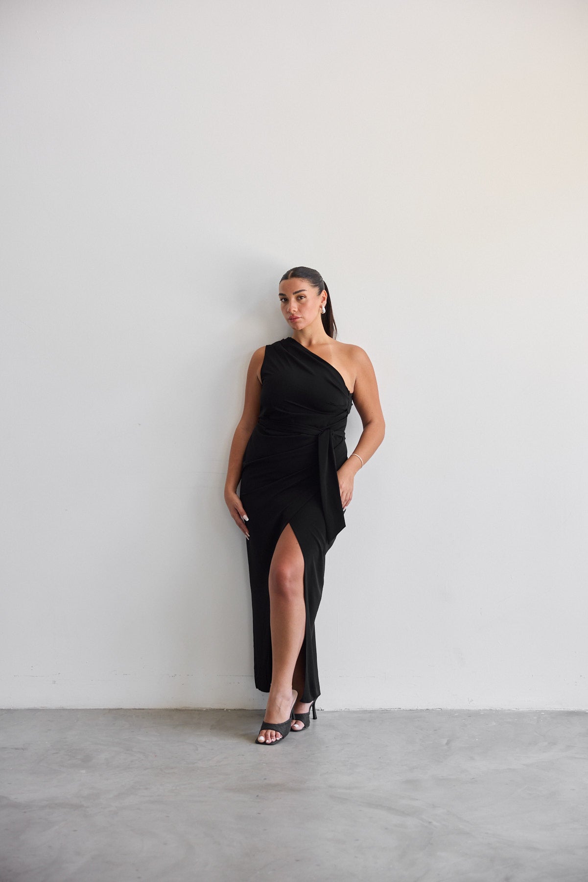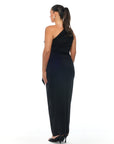 שמלה א-סימטרית בגזרת כתף אחת עם אלמנט קפלים ורבדים מקדימה. ניתן להיכנס על יד